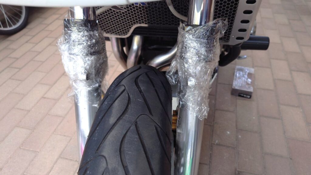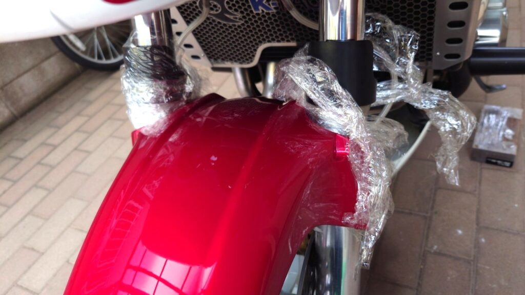 上記のネジ部がフェンダー側面と干渉するので、以下の様にフロントフォークに”ラップ”を巻きます。