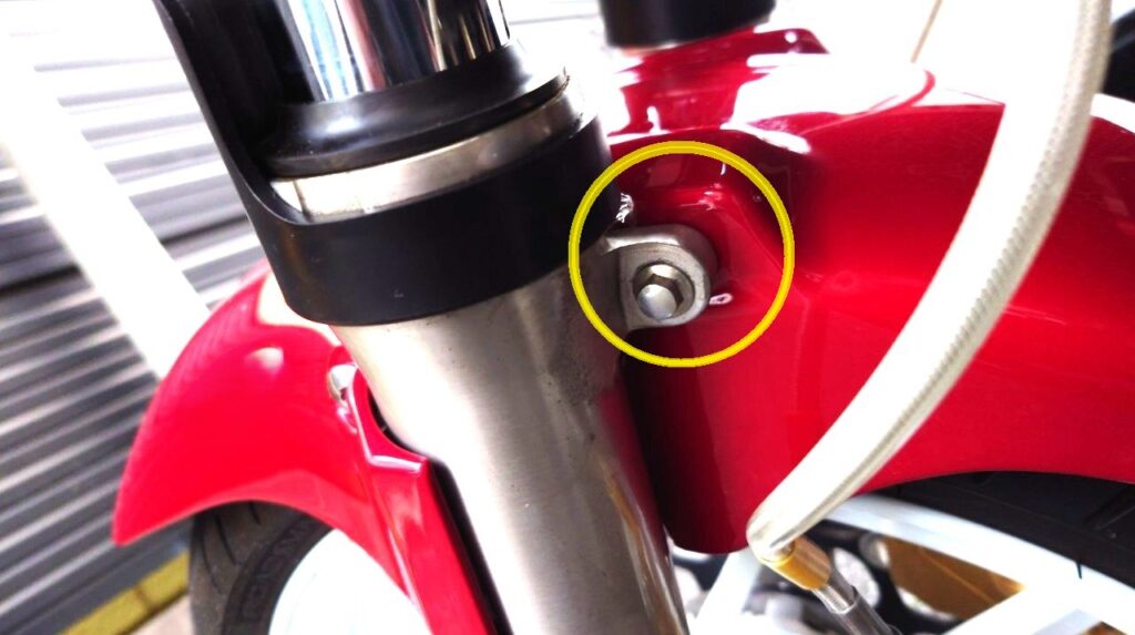 CB1300SBのフロントフェンダーを脱着する際、どうしてもフロントフォークのネジ部と干渉し脱着がしにくいのです。無理に装着しようとすると、せっかく塗った塗装がはがれたり傷が入ったりするリスクがあります。そこで、自分が行っている傷防止方法を紹介します。