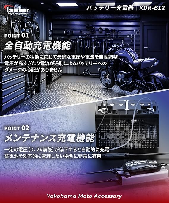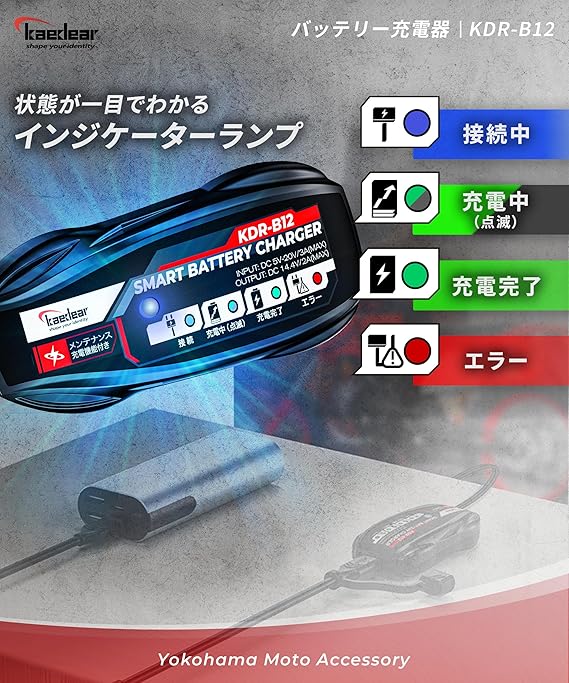 バイクを長期間動かさない時、バッテリー電圧が下がってしまい「いざ動かすときにセルが回らない」というのもよくある悩み。そこで、KDR-B12 が「メンテナンス充電(低電圧維持)機能」を備えているという声も。