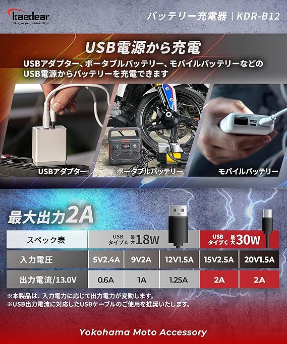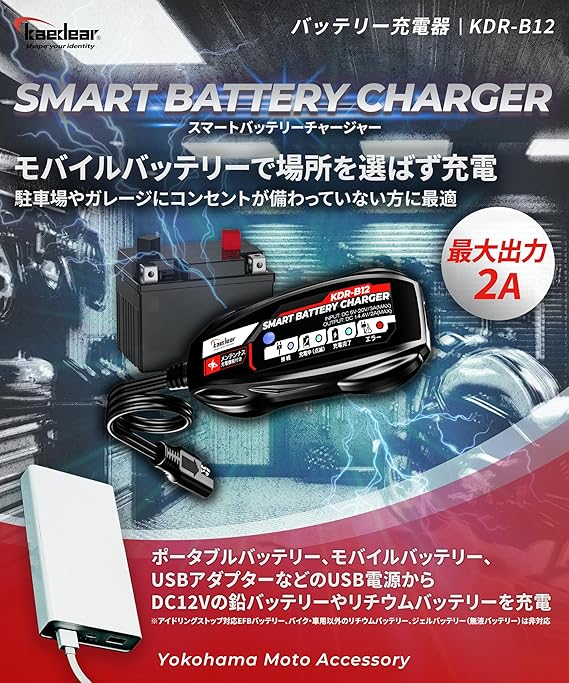 「バッテリーが上がってしまって困った」という声、特に駐輪場に電源がないマンション・アパート住まいのバイクユーザーからよく聞きます。そんな中、USB入力対応でモバイルバッテリーからの充電も可能という、Kaedear(カエディア)のスマートバッテリーチャージャー KDR-B12 が注目されています。ここでは実際のユーザー投稿をもとに、「どう便利か」「どんな場面で使えるか」「選ばれている理由」をたっぷりご紹介します。