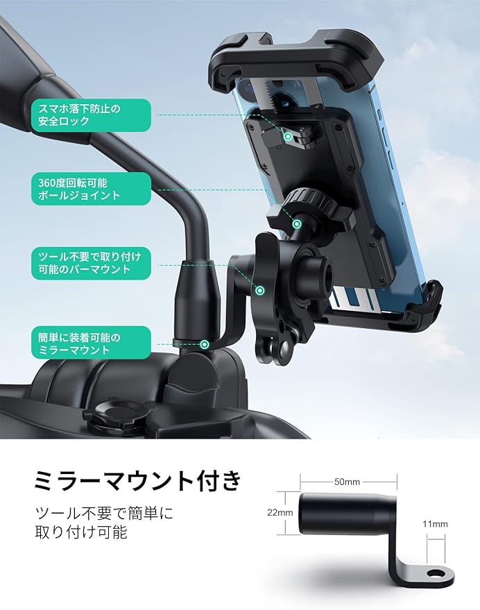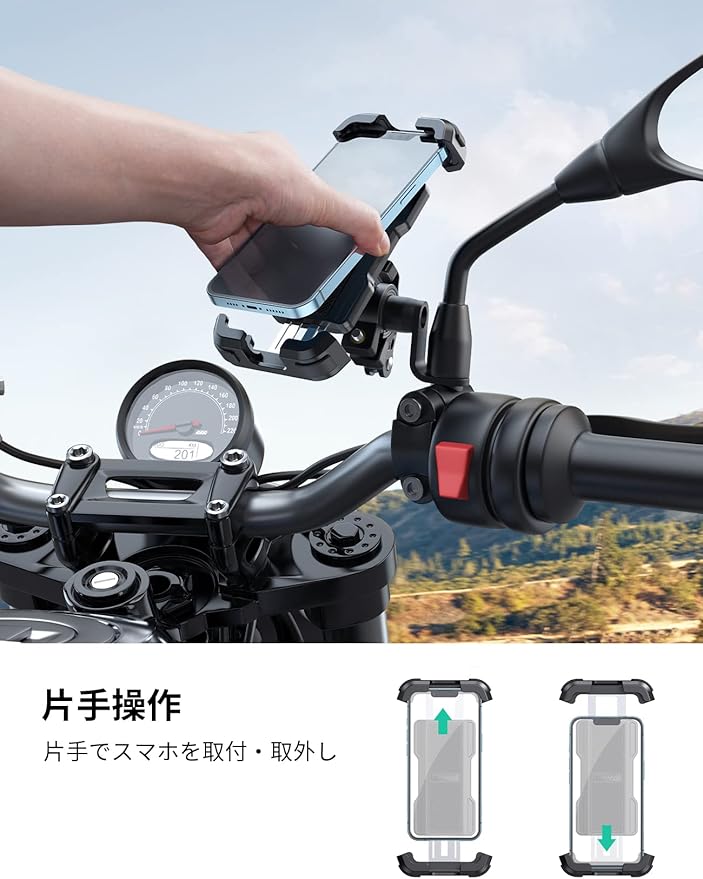 中でも人気の Lamicall(ラミカール)バイクスマホホルダーは、片手で簡単に操作できる ワンタッチ設計 と ミラーマウント取り付け により、多くのライダーから注目されています。