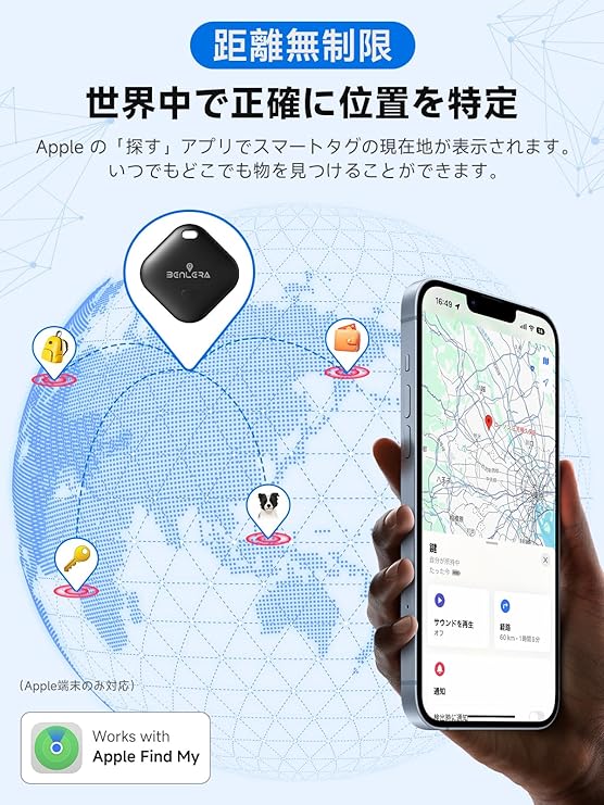 このスマートトラッカーは、Apple純正の「探す」アプリに完全対応。